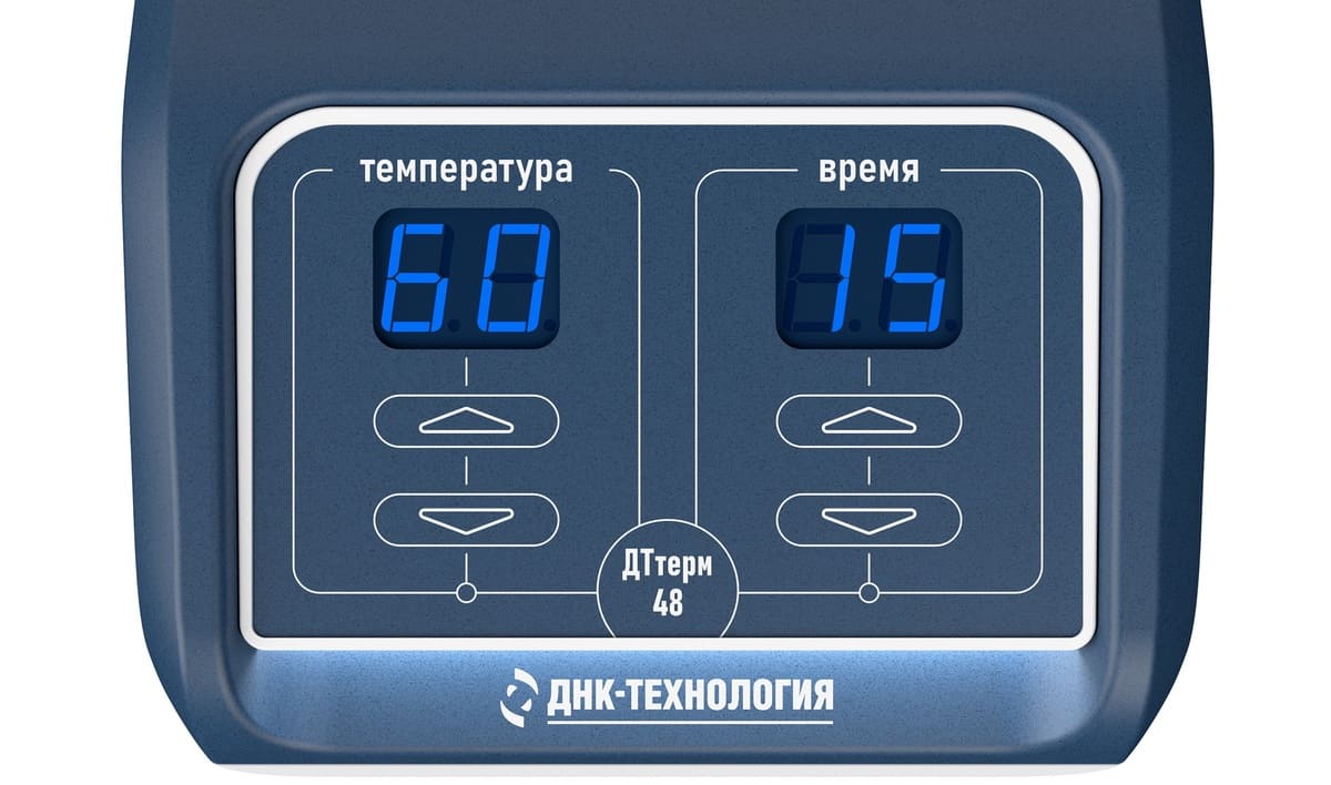 Управление осуществляется через панель, разделённую на 2 области для независимого контроля температуры и времени. Текущие значения отображаются чётко благодаря голубым индикаторам. Встроенный таймер позволяет задавать время термостатирования от 1 до 99 минут с сохранением последнего значения.