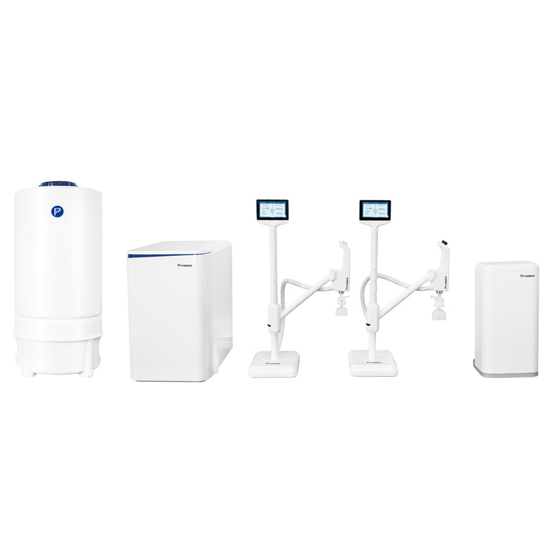 - Два отдельно расположенных диспенсера для отбора воды (тип I и тип II) с сенсорным дисплеем.